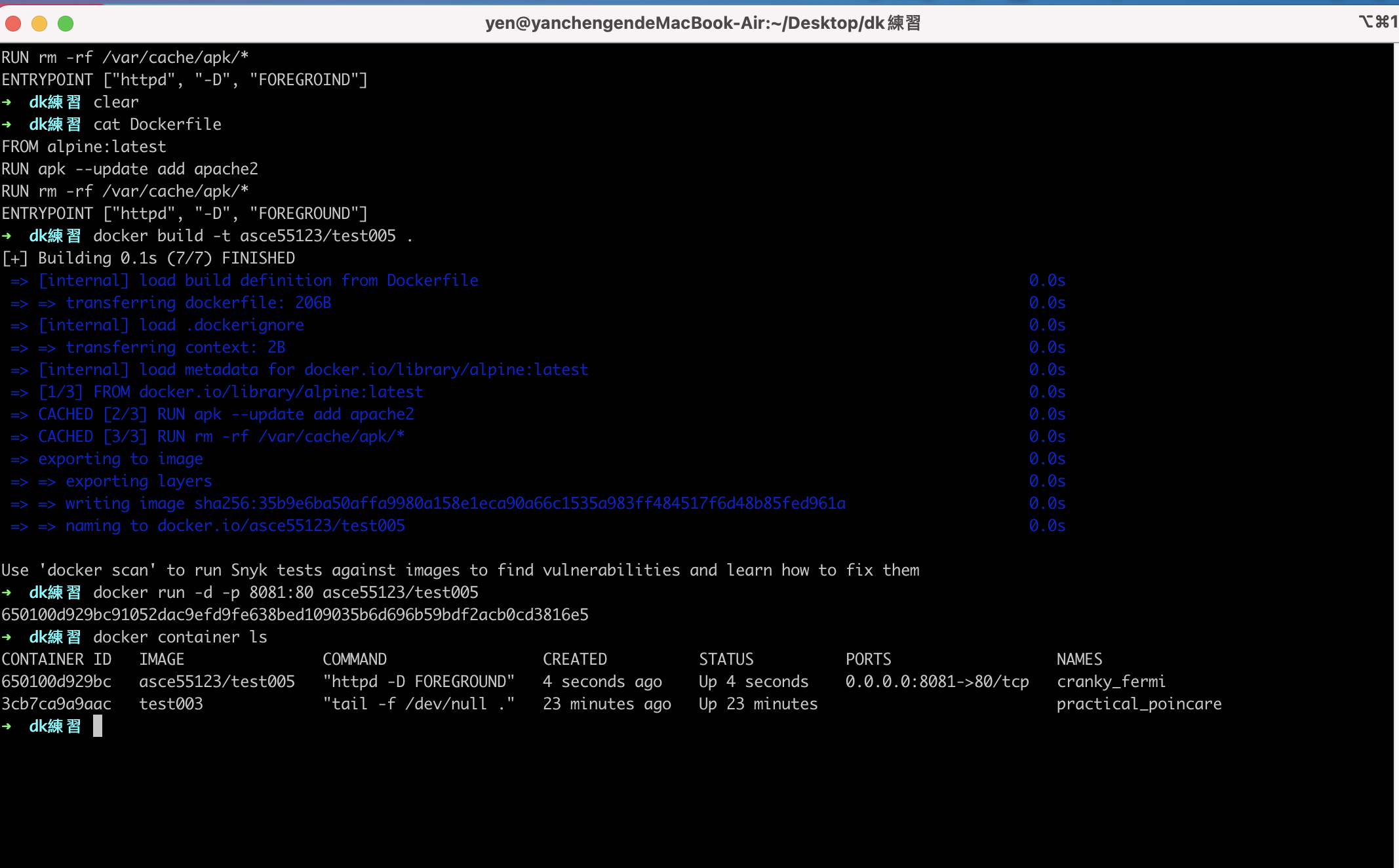 docker run -d -p 8081:80 asce55123/test005 //8081本地port,連線到80 apache port